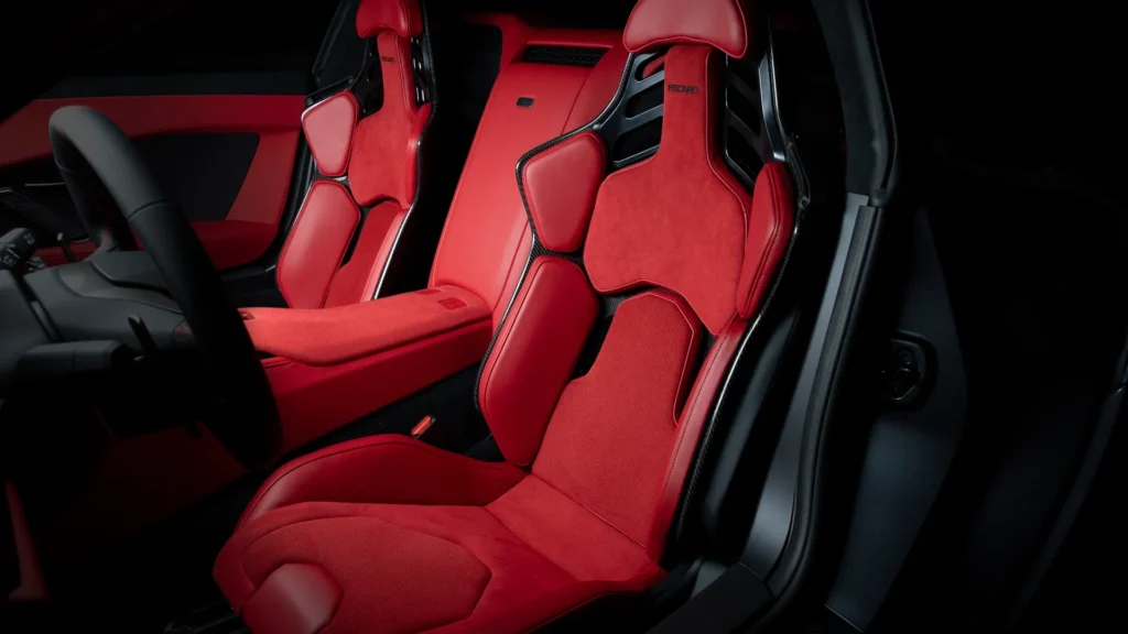 45:55 front-to-rear distribution should read neutral at the limit. Double wishbones and coils all round, Brembo carbon-ceramics the size of dinner plates, Michelin Pilot Sport Cup 2s on lightweight wheels. An ingredients list that says “track-capable without a chiropractor”.